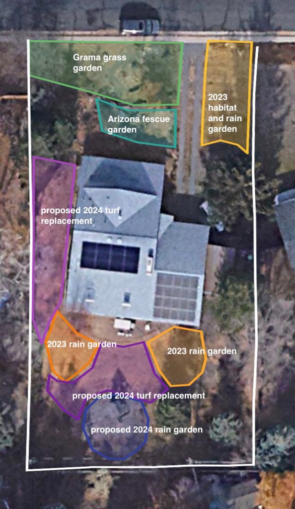 This is feedback I will give to the funders and in advice to others pursuing similar projects. In retrospect, I wish I had had a longer timeline for lawn killing and that I had just done sheet mulching for all of it. I had been planning to do some lawn killing this year, but this grant turbocharged my timeline. In my 2023 habitat and rain garden projects, I had the cardboard and mulch down in the front habitat and rain garden (yellow polygon in schematic) for at least nine months (Fall, Winter, Spring). I feel like I had better killing of existing plants and better tilth in the soil below the sheet mulching, because the materials were more broken down compared to planting sooner after sheet mulching this year. I’m not sure what that would mean for the grant: could they allow people to follow a two year timeline, with the first year for turf removal, and the second for planting? I feel that if they want to steer grantees away from quick fixes (Roundup) or expensive solutions (sod cutting), a longer time span would allow solarization to really fry turf or for sheet mulching to more fully break down.