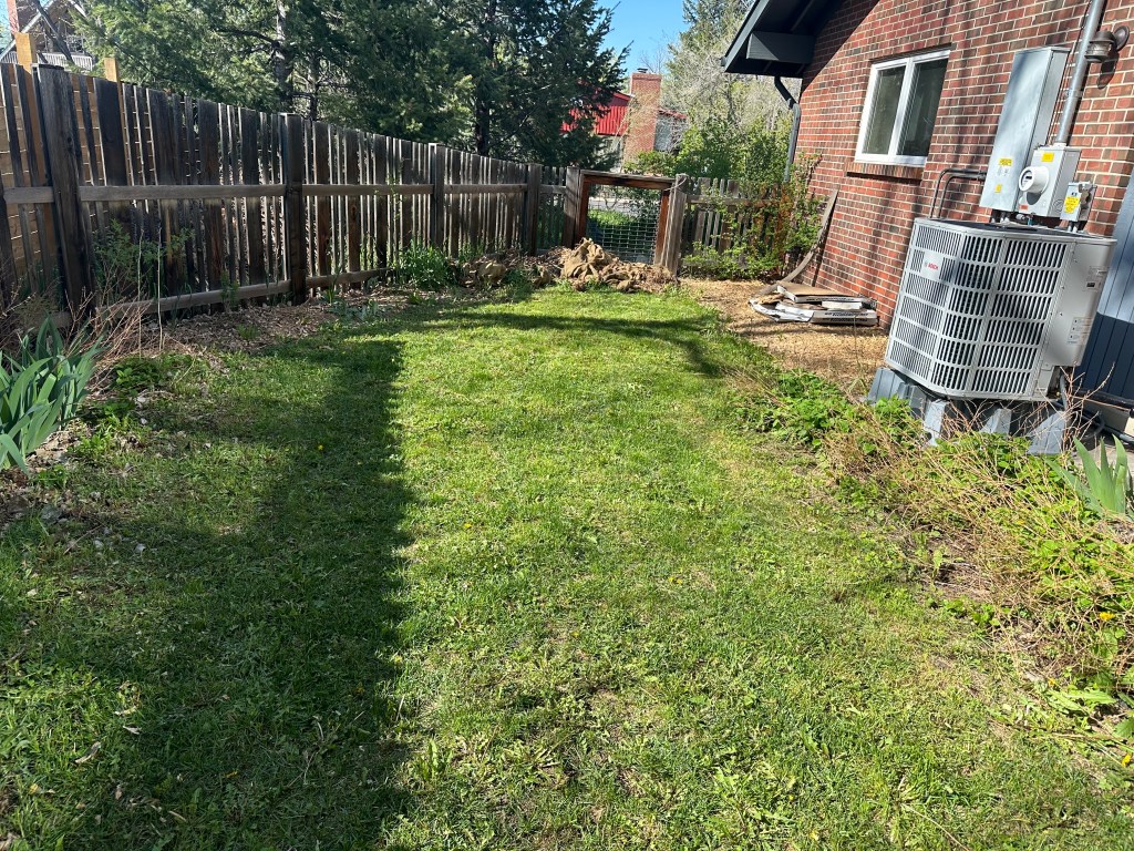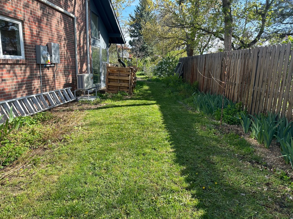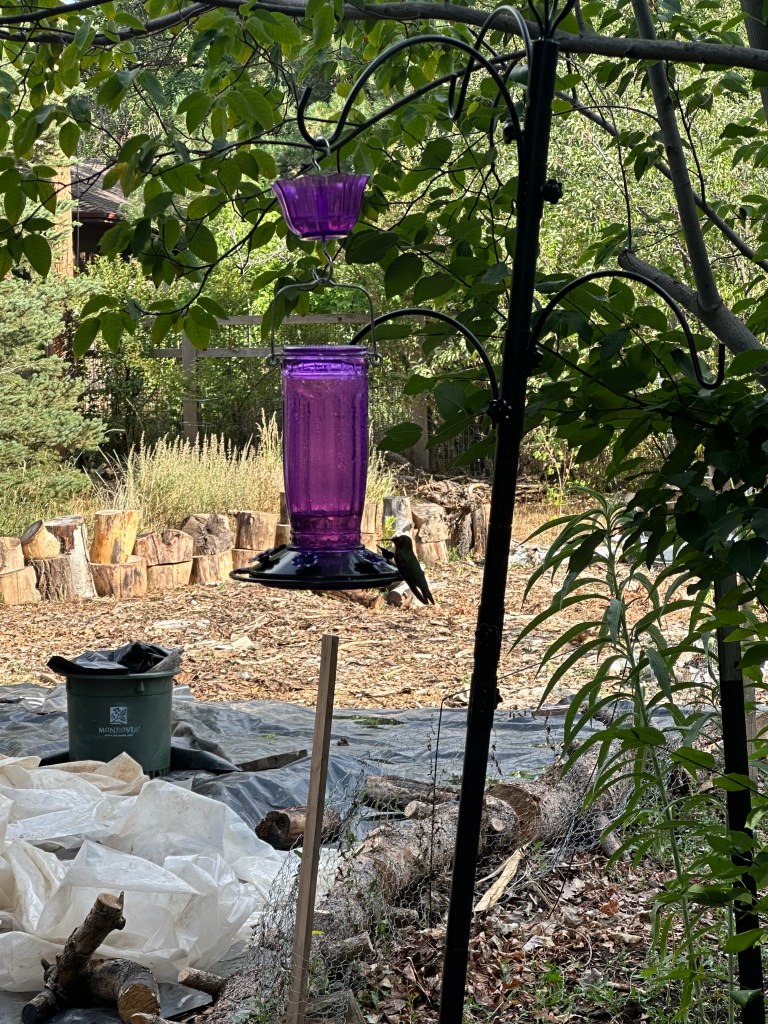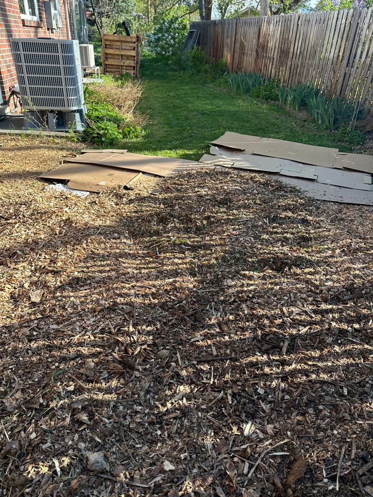 Sheet mulching and I have a happy relationship. I used it when I made the front yard 2023 habitat and rain garden (converting our old veggie garden to natives). It was a good choice for the second big area of turf removal to the west of our house (see the other purple polygon on the left of the image above). What this image doesn’t show is our western neighbor’s many large, tall cottonwood trees. In the morning, our house shades the side yard, and in the afternoon, the neighbor trees shade it. Solarization wasn’t an option; we only have a couple of hours of direct sun in that area and we just wouldn’t have the heat from the sun.